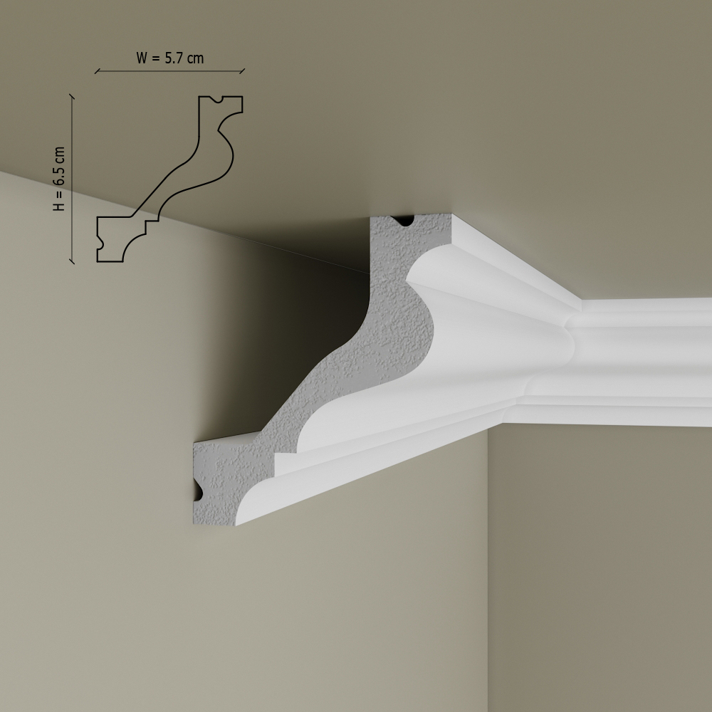 6.5 × 5.7 × 200 cm | Polimer rigid de înaltă calitate | Elegant, clasic-modern, rafinat | Pregătită pentru vopsire | Adeziv pentru decoruri rigide |